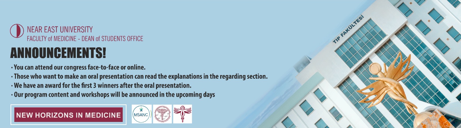 As the students of Near East University Faculty of Medicine, we will be honored and pleased to see you at the 1st International Medical Faculty Student Congress, on 14-16 th April 2022. The aim of our congress is to analyze the reflections of new developments technology in the field of health. You are invited to the beautiful Cyprus to broaden our horizons, be inspired and learn. All university students are invited to our congress. You can attend our congress both face-to-face and online. The congress is completely free; No participation fee will be charged from the participants and listeners who will present their papers. The deadline for abstract submission is March 7, 2022. Certificates of participation will be given at the end of the congress.Okan ERDEMSİZ